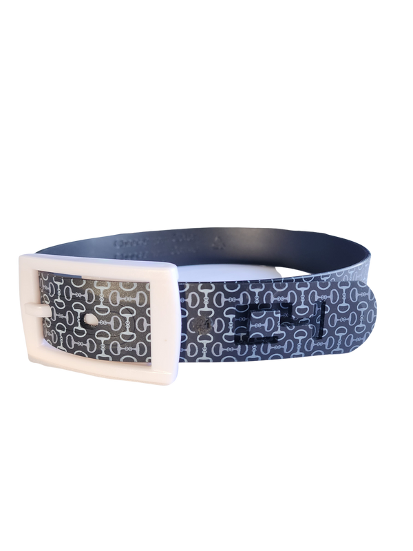 The belt is made from durable, soft and flexible plastic, perfect for horseplay and beyond! When dirty, just place in the top rack of your dishwasher, or hand-wash in the sink with light soap. Belt can be trimmed to fit smaller sizes.