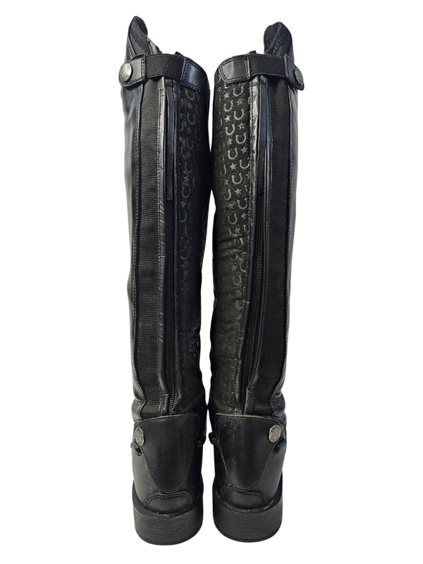 Grip model features an inner leg made of breathable synthetic suede with a silicone horseshoe grip pattern to give the rider a more secure ride. Also features a comfortable EVA insole, dual spur rests, zipper protector, and traditional rubber sole system.